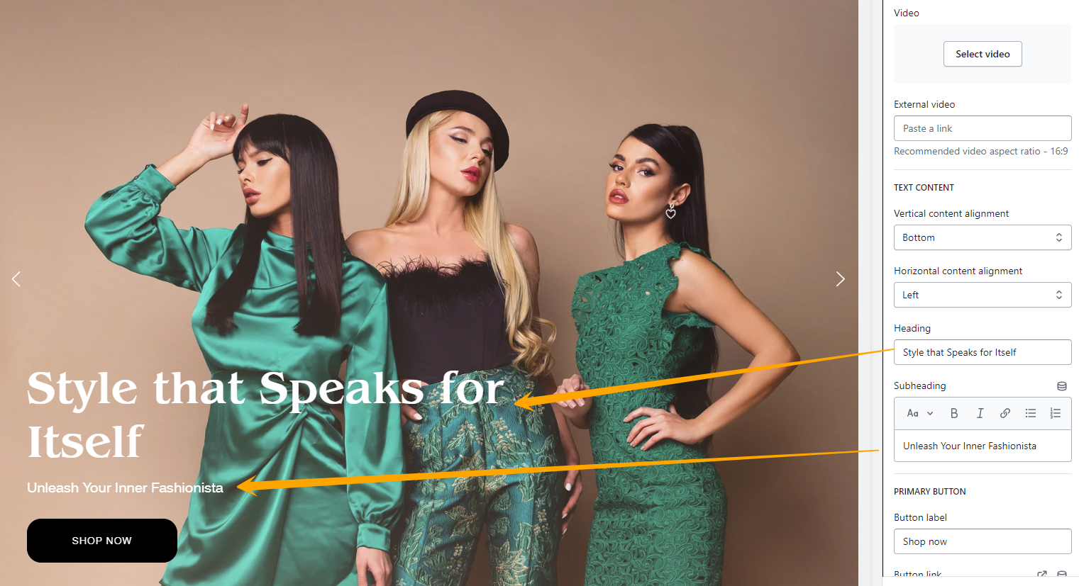 * **Heading** and **Subheading** -- Specify the text showing on top of the image:<br>
