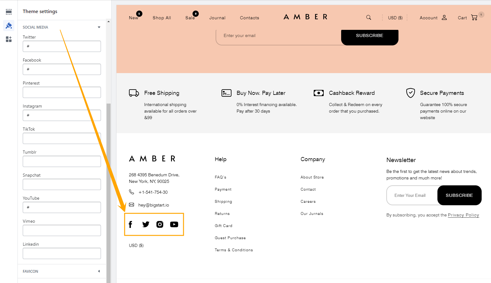 The social icons in the footer will show only when a social media has a link populated in the theme settings.